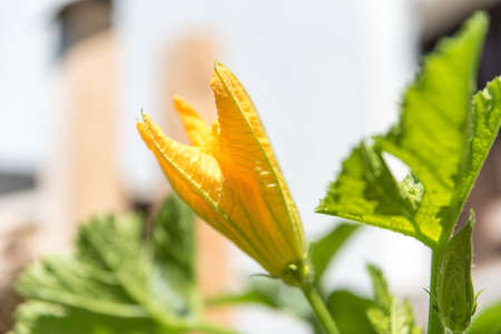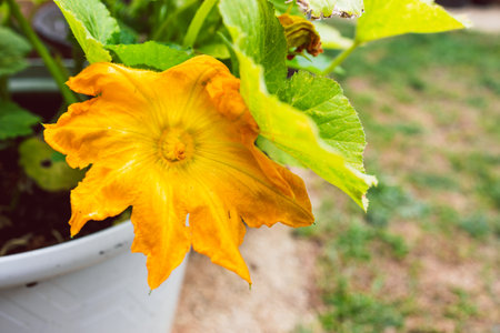 pumpkin squash flowers outdoor in sunny vegetable garden shot at shallow depth of field