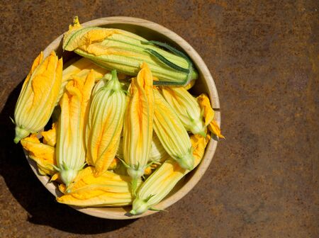 Fresh organic squash Yellow flower in wooden plate on iron rustic background