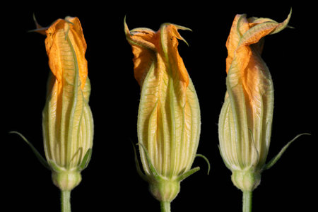 Close up of three zucchini flowers seen side by side. The background is dark. The flowers are yellow, orange and green.