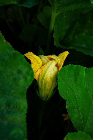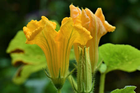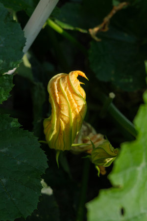 Firm healthy squash flowers bloom hiding the small fruits that will soon grow and fill a basket or dish