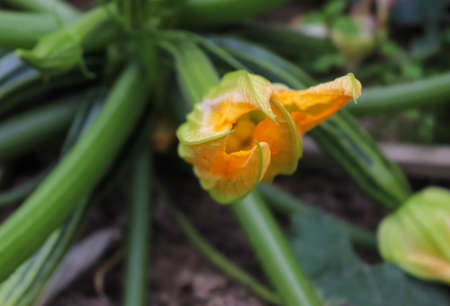 Zucchini and its flower in early summer in an ecological garden, cucurbita pepo