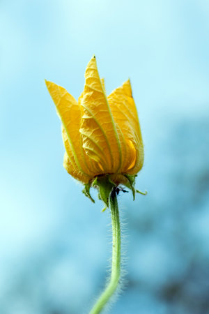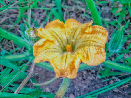 Common pumpkin or Cucurbita pepo. The beginning of summer flowering of a plant of the family Cucurbitaceae