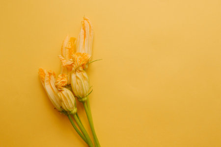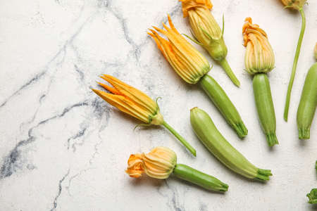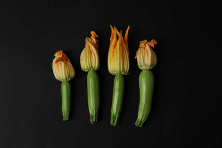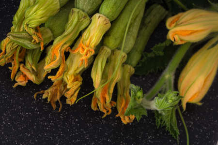 Zucchini or courgette flowers on gray stone background, top view with copy space. Edible flowers, ready to stuffed.