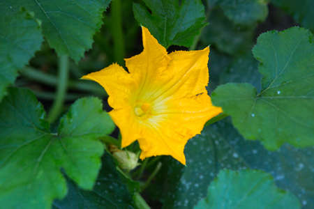 Yellow zucchini flower, pumpkin, in the garden in the shade of leaves