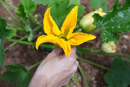 closeup of a young man holding a freshly collected zucchini flower in his hand, in a plantation