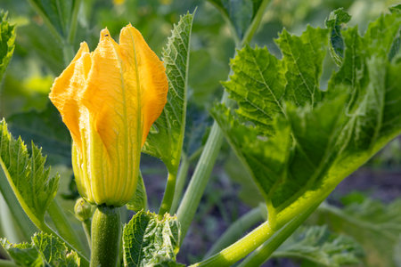 Zucchini or courgette flowers in garden. A vibrant yellow flower atop a green stem with large leaves