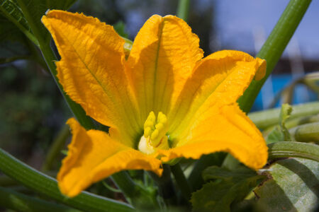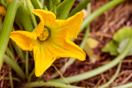 A beautiful yellow zucchini flower blooms in the garden. Courgette plant growing in the summer garden.