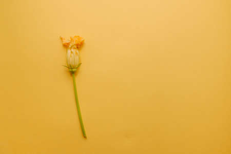 Closeup of young spring zucchini flowers with buds on yellow background.