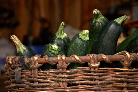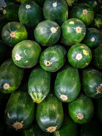 Close Up of Group of Fresh Zucchini at the Italian market on Blurred Background
