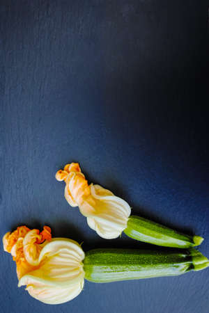Fresh Raw Zucchini with Edible Flowers, copy space for your text