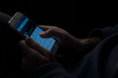Man consults an app on his mobile phone in the dark