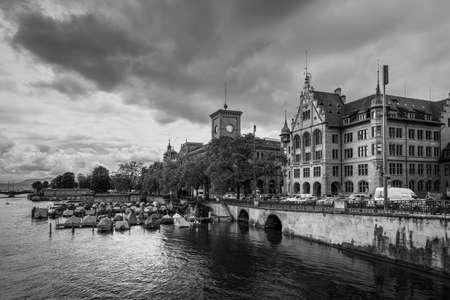 Zurich, Switzerland - May 24, 2016: Architecture of Zurich in overcast rainy weather, the largest city in Switzerland and the capital of the canton of Zurich, Switzerland. Boats in the Limmat river. Black and white photography, dramatic sky.