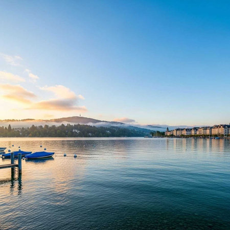 The sun rises majestically over a tranquil Swiss lake, casting a warm glow on the blooming spring landscape and charming villages nearby.