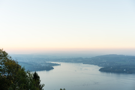 A view of the Küssnachtersee lake or Lake Lucerne (Vierwaldstätersee) and Alpine peak Pilatus in the background from the Rigi Mountain - Canton of Lucerne, Switzerland