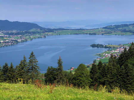 Lake Zurich in Wollerau, canton of Schwyz in Switzerland, Zurichsee, Swiss mountains landscape, blue water and sky in summer, idyllic nature and perfect travel destination, ideal as scenic art print