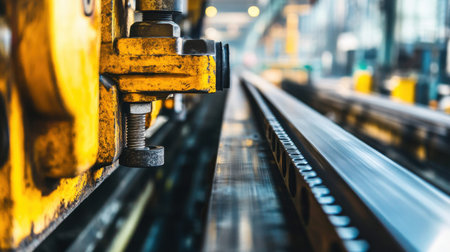 This close-up image showcases industrial machinery in action, highlighting a bolt and rail system that plays a crucial role in manufacturing processes. The vibrant yellow tones contrast with the metallic elements, emphasizing modern technology in a factory environment.