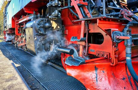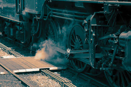 Steam train locomotive engine wheels close-up with steam coming out. With colour toning