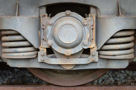 Close up Steel railroad fasteners.Iron nuts fastened to railway tracks.Rusty old iron freight train In the train station, Thai train stops at the station.soft focus.