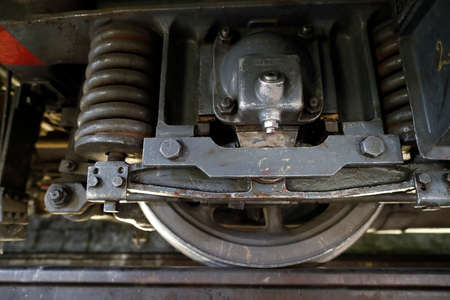 the undercarriage of a traditional mine cart. a restored, old mine car on a fragment of a railway track. the red steel wheels and the black plate of the wagon's chest.