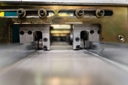 Part of lathe in workshop is close-up. Old lathe for metal processing stands in factory premises. Industrial background.