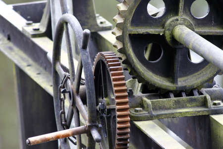 The detail of an old cogwheel gearing. Shabby and rusty, as it was not used for a long time.
