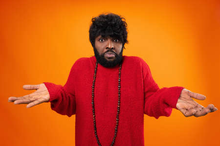 Closeup happy afro guy saying wow on black background. Portrait of african american man looking at camera indoors. Joyful male person posing in studio.
