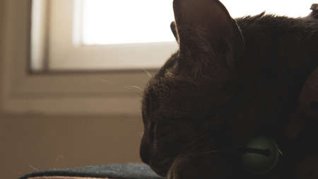 Tabby pussycat sits near windowsill. Domestic cat is resting in pets couch. Window and sunlight in background. Close up animal portrait.