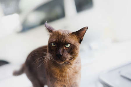A homeless brown cat looking for obervations an prevent himself, Closed up the face and eyes of the cat