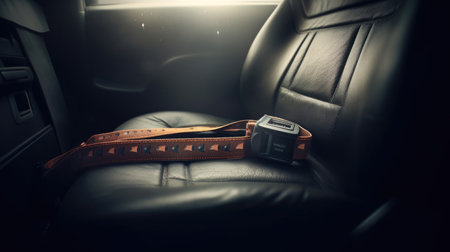 A detailed shot of a safety strap secured on supple leather upholstery, highlighting the vehicle?s interior comfort and focus on safety features.