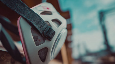 A protective mask is placed on a wooden platform beside a construction site, capturing details of industrial equipment and a bright blue sky above.