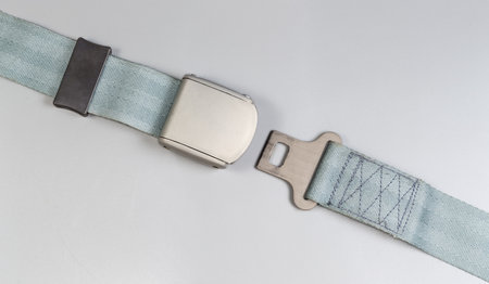 Unfastened buckle of airplane lap seat belt, panoramic top view on a gray background