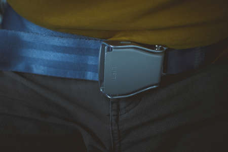 Aeroplane seatbelt buckle in low key dark moody photo. Artistic or different photo of man wearing a seatbelt with a buckle on his belt line.