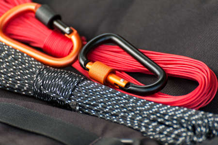 Metal carabine for mountaineering. Photo of colored carabines. Climbing concept