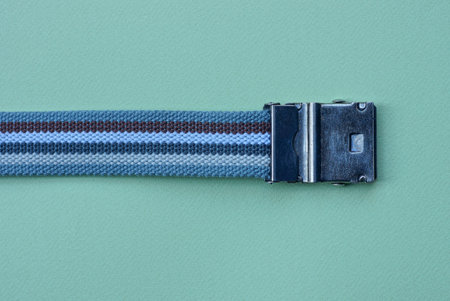 a colored striped belt made of fabric with a gray metal buckle lies on a green table