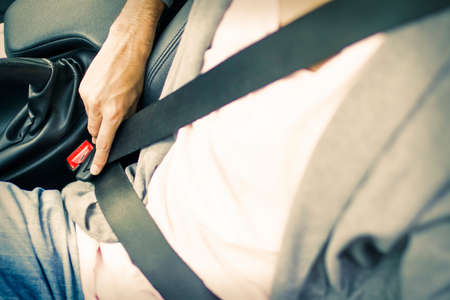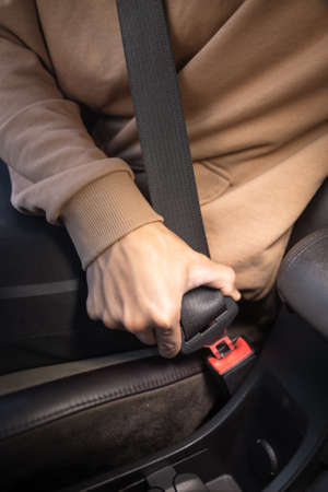 male hand fastens the seat belt of car. Close your car seat belt while sitting inside the car before driving and take a safe journey. Closeup shot of male driver fastens seat belt.