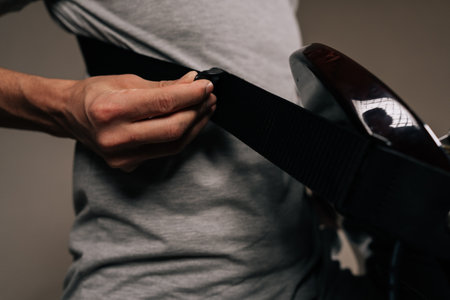 Close up of unrecognizable person fastening seatbelt while driving car, road safety concept, copy space