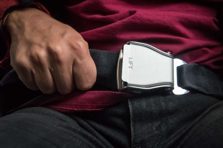 Close-up of a safety belt in the airplane. male hand tightens the safety belt on the abdomen during takeoff or landing. concept of a safe flight. safety while driving