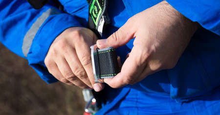 Close-up photo of men's hands are connected by slings with hooks. Tourism, Active rest.