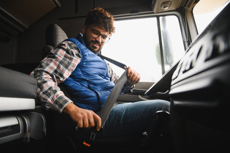 Man in a truck cabin securing seat belt, demonstrating safety and preparedness for long distance transportation and logistics