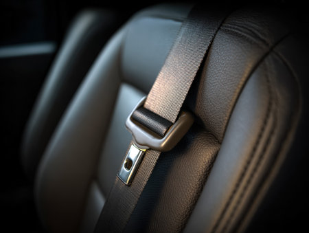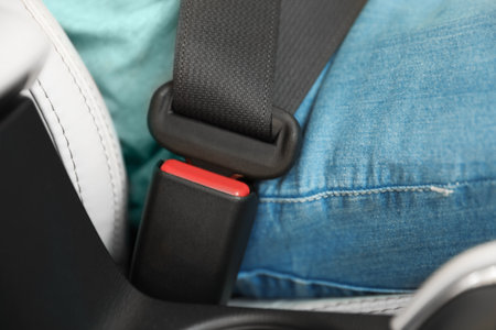 Close up of a car seat belt inside a vehicle, highlighting automotive safety equipment, travel security, and the importance of wearing seat belts for protection