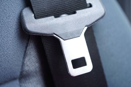 Word press on a seat belt, close up, transportation safety concept background, black seats