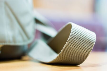 Part of the airplane lap seat belt with unfastened buckle , view close-up in selective focus on a gray background
