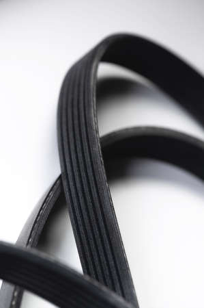 Close-up of a poly V-belt of a generator on a gray background in shallow depth of field. Background for rubber products of auto parts
