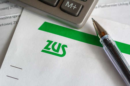 Gdansk, Poland - March 31, 2020: ZUS (National Social Insurance Company) logo on a sheet of paper