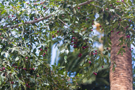 Fresh small red organic brazillian acerola cherry fruit (Malpighia Glabra) with green leaves. Fresh organic Acerola cherry on the tree, High vitamin C and antioxidant fruits.