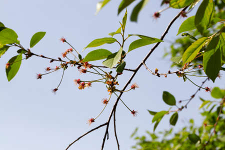 cherry tree in the spring season, the tree has already faded and the flowers have fallen, prominent reddish ovaries of a new berry crop