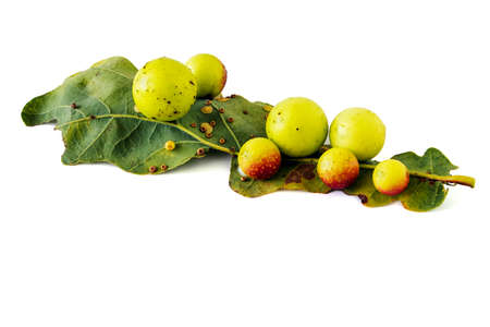 Spherical pieces of oak leaves are formed when oak bile wasps add eggs to their offspring, white background isolated
