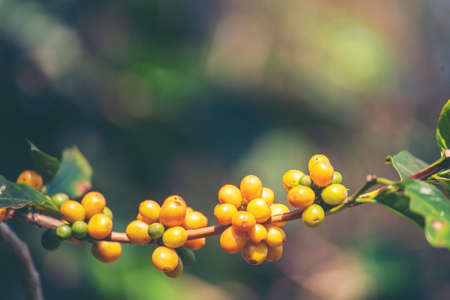 Yellow coffee bean berry plant fresh seed coffee tree growth in Yellow Bourbon eco organic farm. Close up yellow ripe seed berries harvest arabica coffee garden. Fresh coffee bean green leaf bush