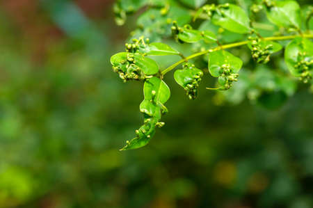 White fruits of Sauropus Androgynus and blur background. Thailand. Another name is Katuk, Phyllanthus geoffrayi, Senna Sophera.