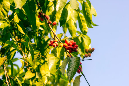 closeup the bunch black red curry tree fruit with leaves and plant in the forest soft focus natural green brown background.
